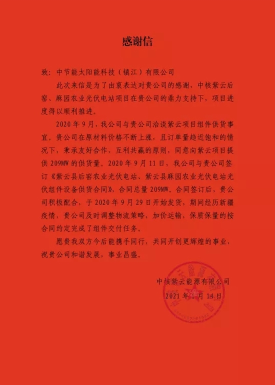 ? ? ? ?在信中,中核紫云能源有限公司充分肯定了鎮(zhèn)江公司在合作中,秉承“客戶第一”的原則,克服新冠疫情及原材料價(jià)格上漲等種種困難,積極協(xié)調(diào)、加價(jià)運(yùn)輸,保質(zhì)保量完成組件交付任務(wù),確保項(xiàng)目順利推進(jìn)的努力與成效。 ? ? ? 急客戶之所急,想客戶之所想。一直以來,鎮(zhèn)江公司堅(jiān)持用心服務(wù),始終將客戶需求放在第一位,千方百計(jì)解決客戶困難,用專業(yè)服務(wù)精神為客戶創(chuàng)造價(jià)值。 每一句感謝的話 以客戶為中心