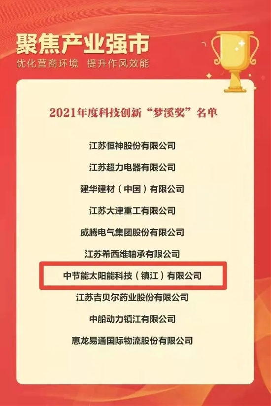 ? 2月8日,鎮(zhèn)江市委、市政府召開鎮(zhèn)江市產(chǎn)業(yè)強(qiáng)市暨優(yōu)化營(yíng)商環(huán)境大會(huì),并表彰2021年度制造業(yè)“金山獎(jiǎng)”,科技創(chuàng)新“夢(mèng)溪獎(jiǎng)”,優(yōu)化營(yíng)商環(huán)境“甘露獎(jiǎng)”等11個(gè)獎(jiǎng)項(xiàng)。鎮(zhèn)江公司從眾多國(guó)家高新技術(shù)企業(yè)中脫穎而出,被授予科技創(chuàng)新“夢(mèng)溪獎(jiǎng)”這一殊榮。
