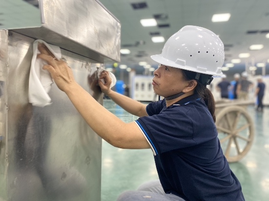 定制的不銹鋼工作臺(tái)已放置到新車間,生產(chǎn)人員正在對(duì)其進(jìn)行清理清潔