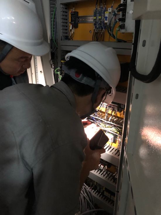 匯流條自動(dòng)焊接機(jī)已安裝定位完成,設(shè)備部員工正在配電柜內(nèi)整理線路,對(duì)接線路信號(hào)點(diǎn)位