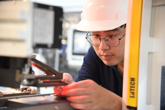 倒班工程師魏晨配合排版機(jī)廠家,對(duì)排版機(jī)機(jī)械手吸串位置進(jìn)行調(diào)試,工作服已被汗水完全浸濕,但他仍在一絲不茍的完成工作