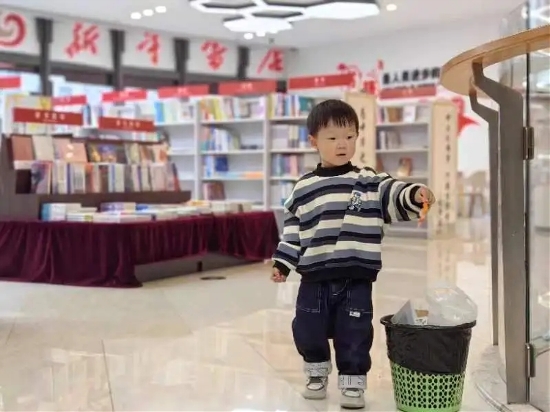 為地球發(fā)聲,我來接力。為了書店的整潔,小寶撿起了垃圾丟到垃圾桶里啦。