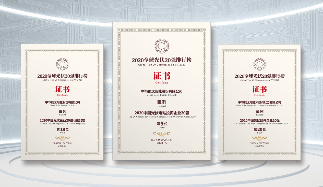 On May 10, 2020, the “Global Top 20 Companies on PV 2020” launched and sponsored by PVP365 was officially released in Beijing to the world. According to the results, CECEP Solar Energy Co., Ltd. was honored as the “Top 20 Chinese Investment Companies on PV Power Plants 2020” and the “Chinese Top 20 Companies on PV 2020 (Integrated)”, while CECEP Solar Energy Technology (Zhenjiang) Co., Ltd. was listed on the “Top 20 Chinese Solar Panel Companies on PV Power Plants 2020”. These awards attach great importance to the development of PV power stations and the whole PV industrial chain, highlight the PV industrial development of China, and speculate the PV industrial pattern all over the world. They always devote themselves to exploring advantages of the PV industry, establishing industry models, forming clear value orientation, and enhancing the communication and economic ties between companies. It is reported that these awards demonstrate the business performance of competitive global and Chinese PV companies in the previous year in such aspects as integrated strength, investment in Chinese PV power stations, EPC, solar panel, inverter and rack, spotlight outstanding companies specialized in different segments, and provide reliable value data for development, research, investment and cooperation of the industry. Honors for CECEP Solar Energy Co., Ltd. and CECEP Solar Energy Technology (Zhenjiang) Co., Ltd. show that efforts made by CECEP Solar Energy Co., Ltd. to provide high-quality products and services, invest in PV power stations, guarantee the quality and build its brands have been highly recognized, and the company’s excellent image and continuous contributions to the PV industry have been affirmed.