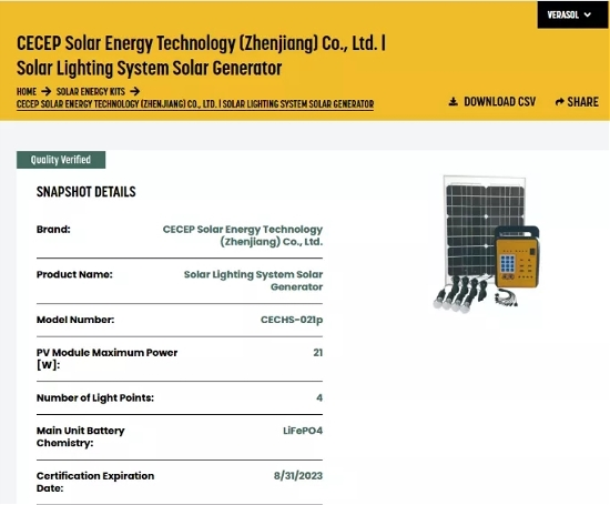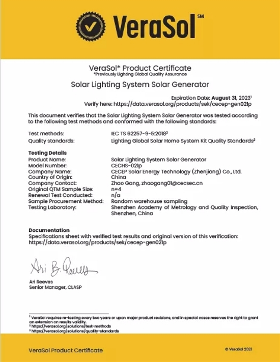 The “Lighting Global” project is a platform set up by the World Bank Group, which provides support for the global modern off-grid energy market and promotes the sustainable development of the international off-grid solar energy market through its widely applicable and strict quality assurance framework. The Lighting Global project promotes the development of market by cooperating with enterprises and helping enterprises that have just entered the market to reduce risks, and activates the investment in the field of private-owned business through market research, quality assurance projects, business support services and consumer education. Up to now, the off-grid solar projects owned by the World Bank Group have extended to more than 30 countries, of which 26 are in Africa. The “Lighting Global” project provides consumers, professional buyers, investors and project developers with accurate and reliable third-party product certification to help them make decisions on the off-grid solar energy market. Manufacturers can stand out from competitors by increasing market recognition for their products with the help of “Lighting Global” quality certification.” Up to now, 24 developing countries have expanded their market access to the “Lighting Global” quality standard. In August this year, two off-grid solar home systems developed by CECEP Solar Energy Technology (Zhenjiang) Co., Ltd. for African market passed rigorous tests and obtained the product test report that conforms to international IEC standards issued by the Shenzhen Academy of Metrology & Quality Inspection, and also passed the “Lighting Global Certification”.? The off-grid solar home system independently developed by CECEP Solar Energy Technology (Zhenjiang) Co., Ltd. obtained the “Lighting Global” certificate. Make all efforts to tackle key problems, Successfully passed the Lighting Global certification Early in October 2019, the technical researchers of CECEP Solar Energy Technology (Zhenjiang) Co., Ltd. began to carry out market research on African off-grid solar systems. In February 2020, the product design was carried out in accordance with the research data, and the parameters of the series of two products, “CECHES021P” and “CECHES026” were determined before starting the phase of entity development and paygo payment system software debugging. While researchers are working on technological breakthroughs, the certification process of Lighting Global project is carried out simultaneously. In December 2020, the completed 200 sets of off-grid products were sent to Shenzhen Academy of Metrology & Quality Inspection for IEC 62257-9-5 test by CECEP Solar Energy Technology (Zhenjiang) Co., Ltd. In August 2021, researchers overcame many difficulties caused by the epidemic at home and abroad to pass a series of strict tests and obtained the product test report that conforms to international IEC standards issued by Shenzhen Academy of Metrology & Quality Inspection, and passed the “Lighting Global” certification. Lighting Global certification, Endorsement for product quality The high standards, strict requirements and high value of “Lighting Global Certification” can ensure that the certified products meet the high requirements of solar lighting in global countries with power shortage. The success in passing the “Lighting Global” certification means that our off-grid solar home system can better meet the power demand of African countries in all aspects, and bring more stable and reliable solar lighting and related solar application products to local users.? The major product “CHCHES021” launched by CECEP Solar Energy Technology (Zhenjiang) Co., Ltd. is a multi-functional off-grid solar product that combines energy storage, lighting, music playing and lease payment together. The professional integrated cavity designed for the system is delicate and shock-resistant; The cycle life, energy density and safety performance of the energy storage cell meet the international standards; The functional design of lease payment is also a technological innovation that takes a full consideration of the living standards of the people in the African market, which effectively reduce the consumption threshold by allowing more people to have the right to use products with very little money in advance; This product is also applicable to life scenarios such as family emergency and road trip camping.? Lighting Global certification, Help explore the African market As the year of 2021 is the year of market expansion of CECEP, CECEP Solar Energy Technology (Zhenjiang) Co., Ltd. also faces the work of market expansion in a new field. “Lighting Global Certification” provides an opportunity for CECEP Solar Energy Technology (Zhenjiang) Co., Ltd. to explore the African market. In the future, our company can get broader business opportunities with the help of the Lighting Global business development services, such as the opportunity to participate in electrification projects invested or loaned by the World Bank including off-grid electrification in Africa. At the 130th China Import and Export Fair this autumn, the off-grid solar home system developed by CECEP Solar Energy Technology (Zhenjiang) Co., Ltd. received many inquiries from competitors at home and abroad by virtue of the “Lighting Global Certification”, and signed contracts with them on selling 200 sets of off-grid solar home systems to Africa, which means that CECEP Solar Energy Technology (Zhenjiang) Co., Ltd. has a new profit growth point to help the company transform and upgrade. As a new business that has a great potential to develop at present, the off-grid solar home system has a huge market potential in Africa. In the meanwhile, Lighting Global Certification has helped CECEP Solar Energy Technology (Zhenjiang) Co., Ltd. to seize the opportunities in exploring the African market, which laid a good foundation for further opening up the overseas mar