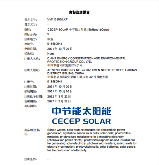Good News! Successful Registration of the "CECEP SOLAR" Trademark in the EU and Japan! |
